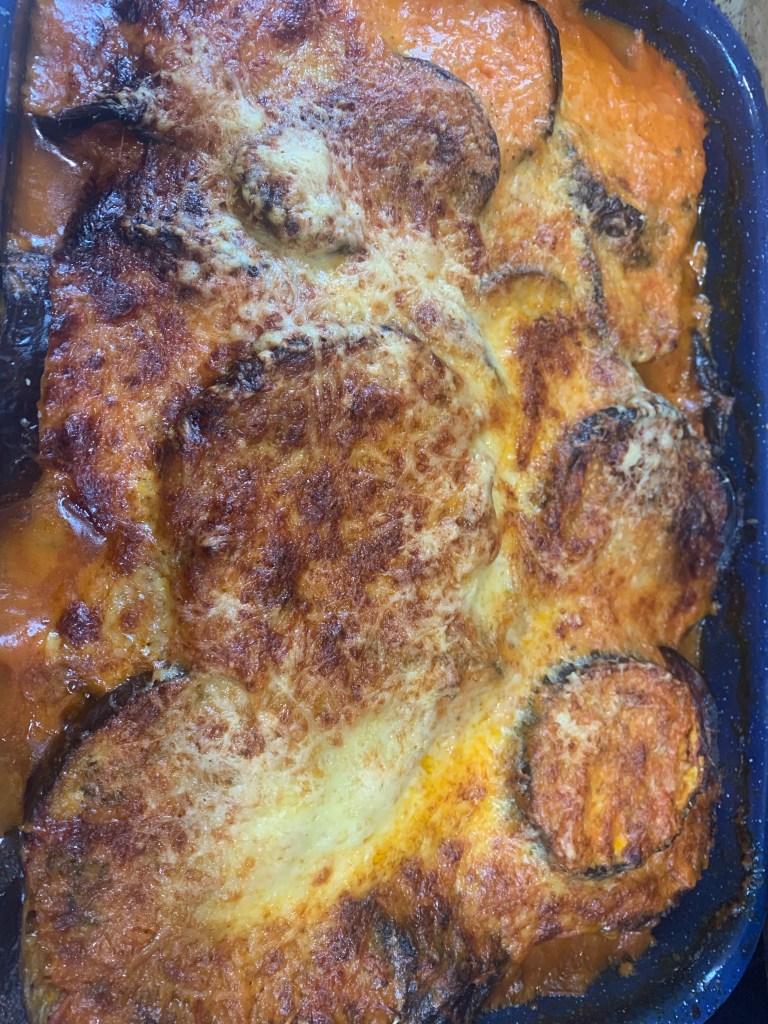 Slice 5-6 eggplants and coat with olive oil using a pastry brush then season. Roast in a baking dish for about 30 minutes at 180 degrees celcius. Pour over 1L home made tomato sauce, and top with grated Parmesan cheese. Roast for 20 minutes at 180 degrees celcius.