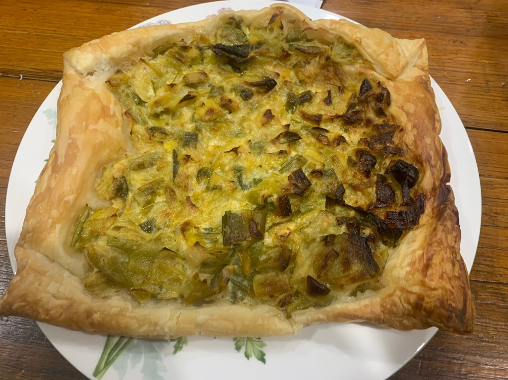 Slice 3 leeks and 1 celery stalk and sweat in a pan with olive oil on very low heat. Add 300ml cream and then 1 beaten egg. Season.