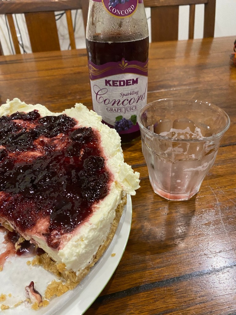 Beat 2 x 250g blocks Philadelphia cream cheese with 120g sifted icing sugar, the juice of one lemon and a teaspoon vanilla extract. Whip a 600ml bottle of cream. Combine the cream cheese mixture with the whipped cream. Process a 355g package of digestive biscuits in a food processor and mix with 150g melted butter.